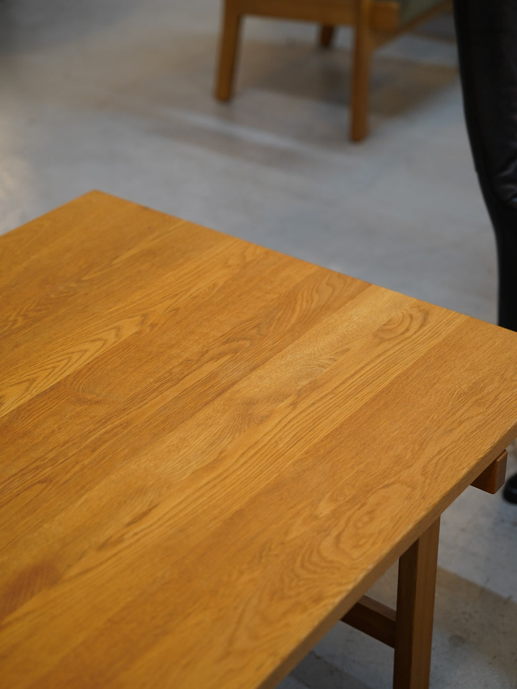 素材には、北欧家具を象徴する耐久性と美しい木目を持つオーク材が贅沢に用いられ、長年の使用により深みを増した黄金色の木肌は、空間に格別の品格をもたらします。デザインは、ウェグナーの「素材と構造への敬意」が凝縮されており、無駄を削ぎ落としたタイムレスなフォルムが特徴です。特に、天板と脚を接合する精巧なホゾ組みのディテールは、PPモブラーの高度な木工技術の証であり、工芸品の美しさを放ちます。リビングルームを最高峰のヴィンテージ家具で彩りたい方へ。次の世代へと受け継ぐにふさわしい北欧デザインの傑作です。