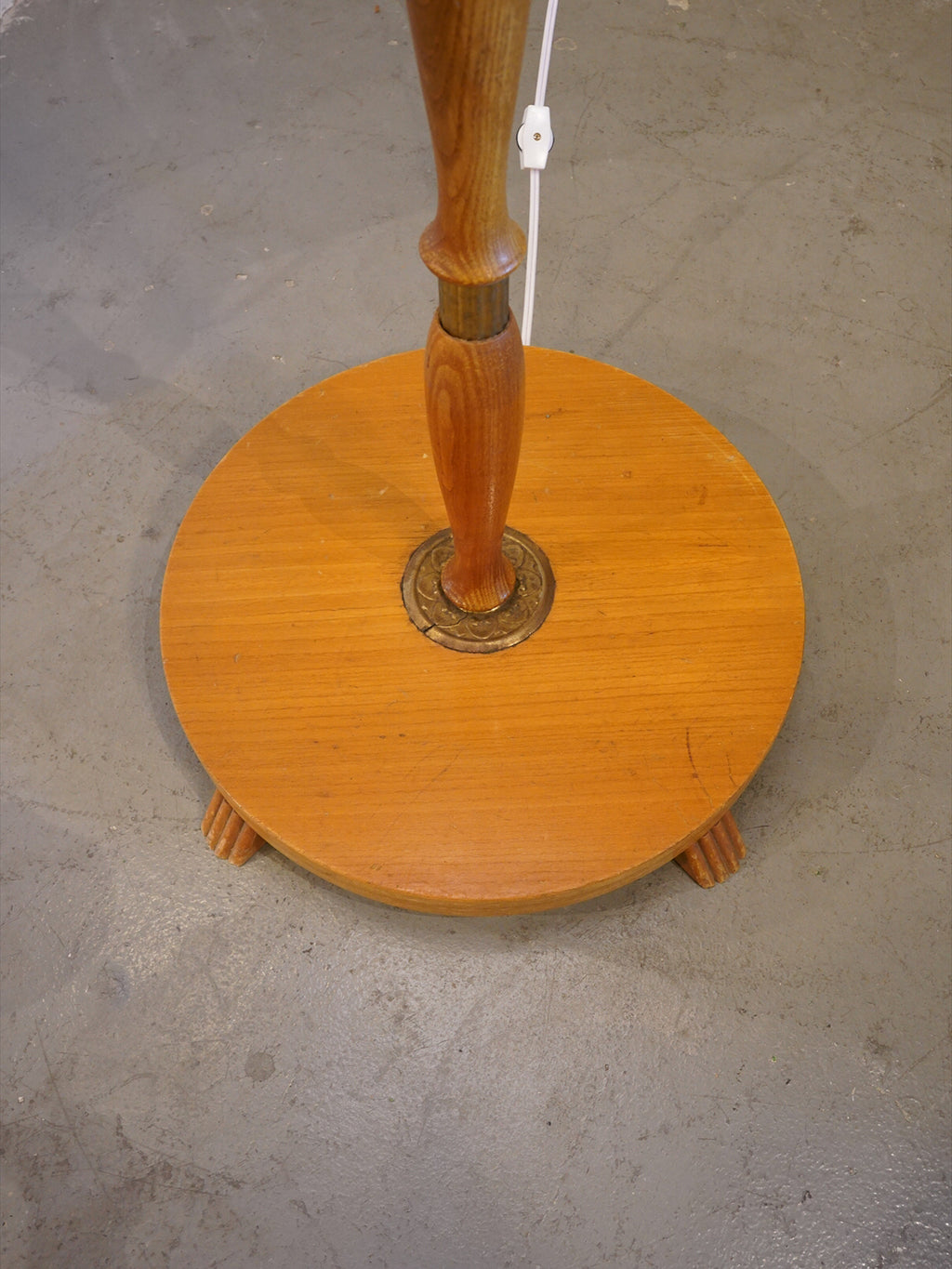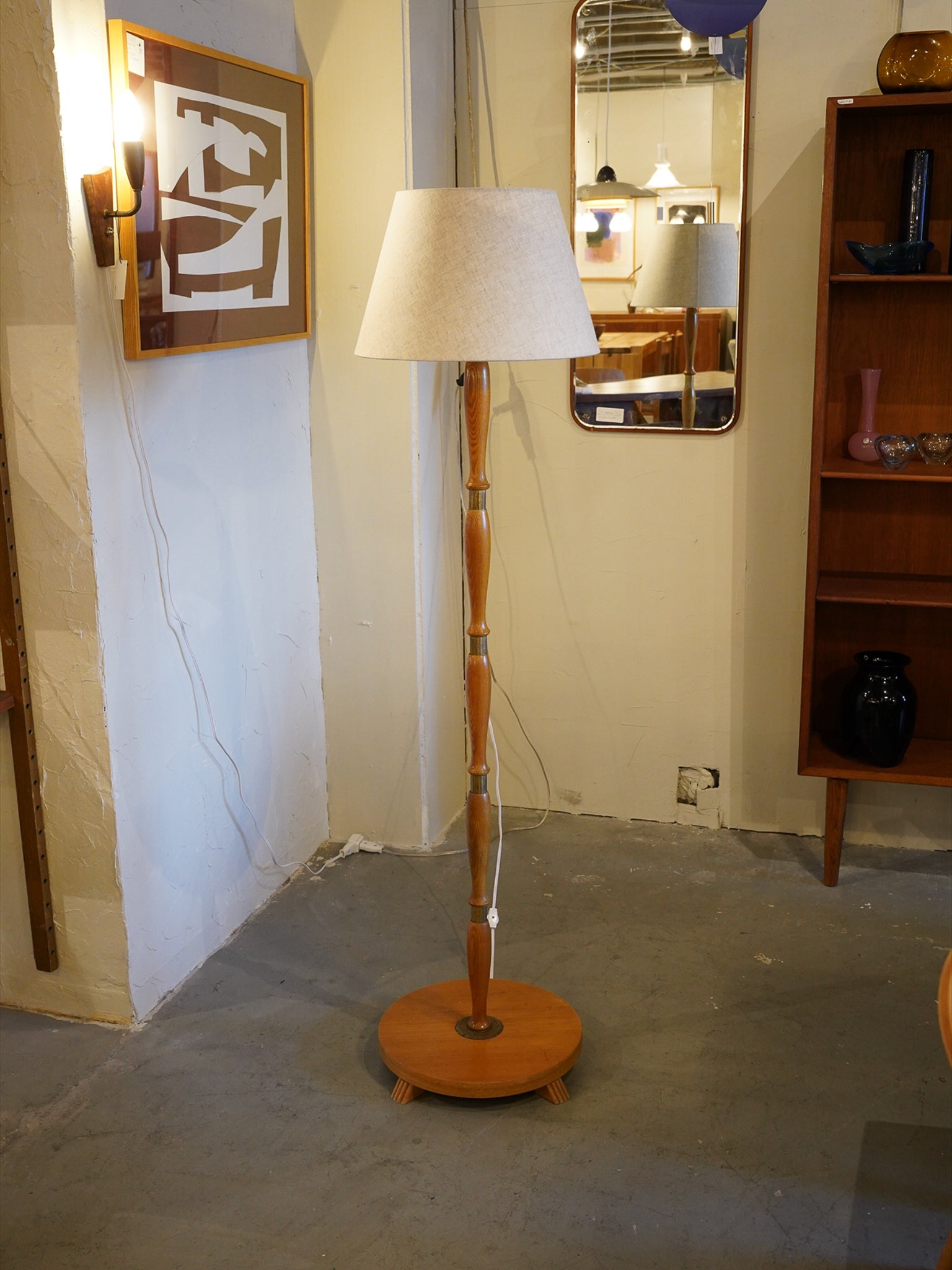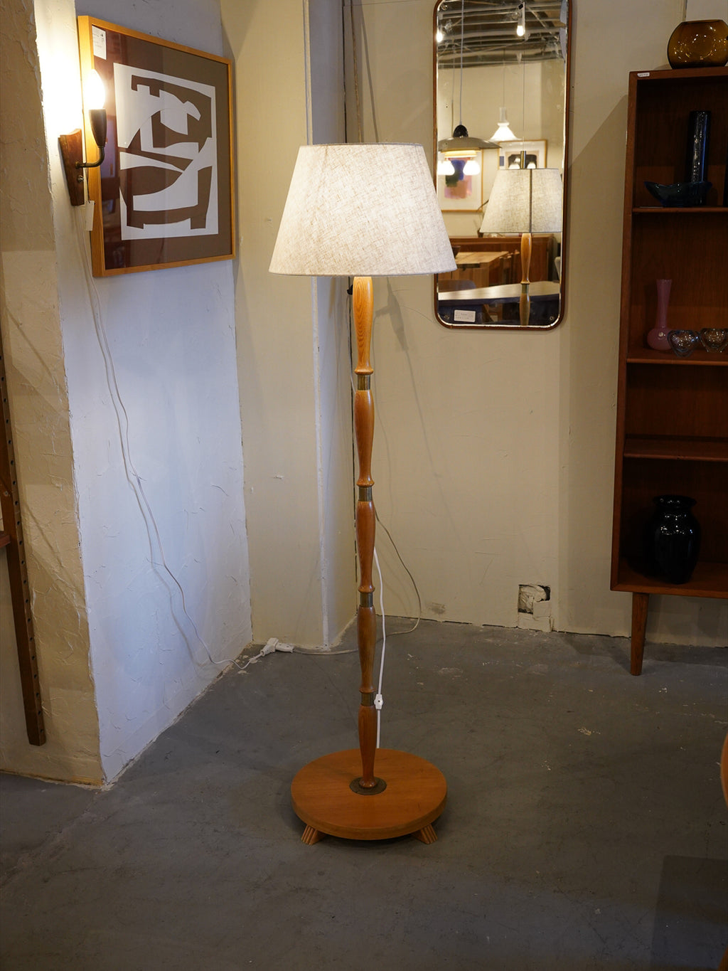 おそらく1950年代から1960年代にかけてスウェーデンで製造された、歴史と温もりを感じさせる北欧ミッドセンチュリーデザインの木製フロアランプです。