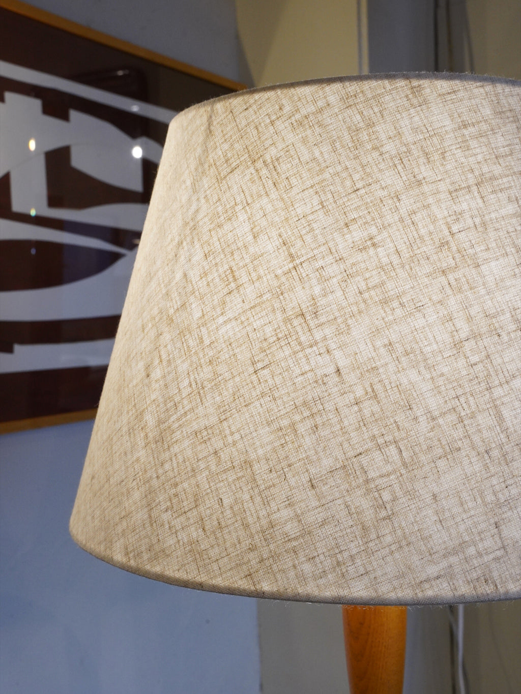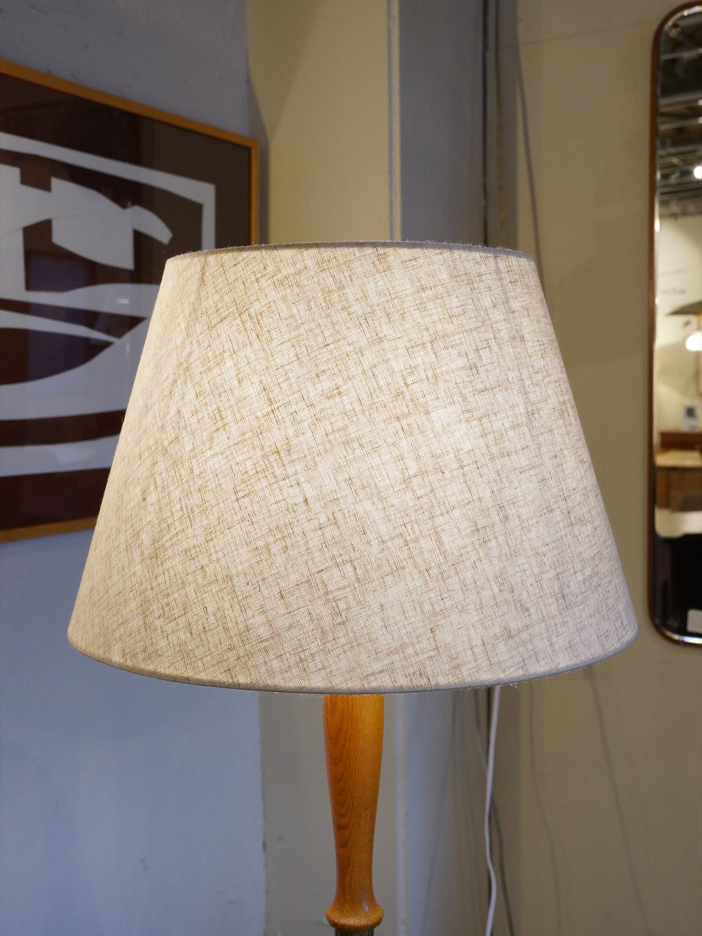 上部に配置された大型の布製シェードを通して広がる光は、広範囲にわたって均一で柔らかく、リビングや寝室を優しく包み込む間接照明として最適です。木製の本体は、当時の北欧家具とも相性抜群で、空間に落ち着きと上質さをもたらします。