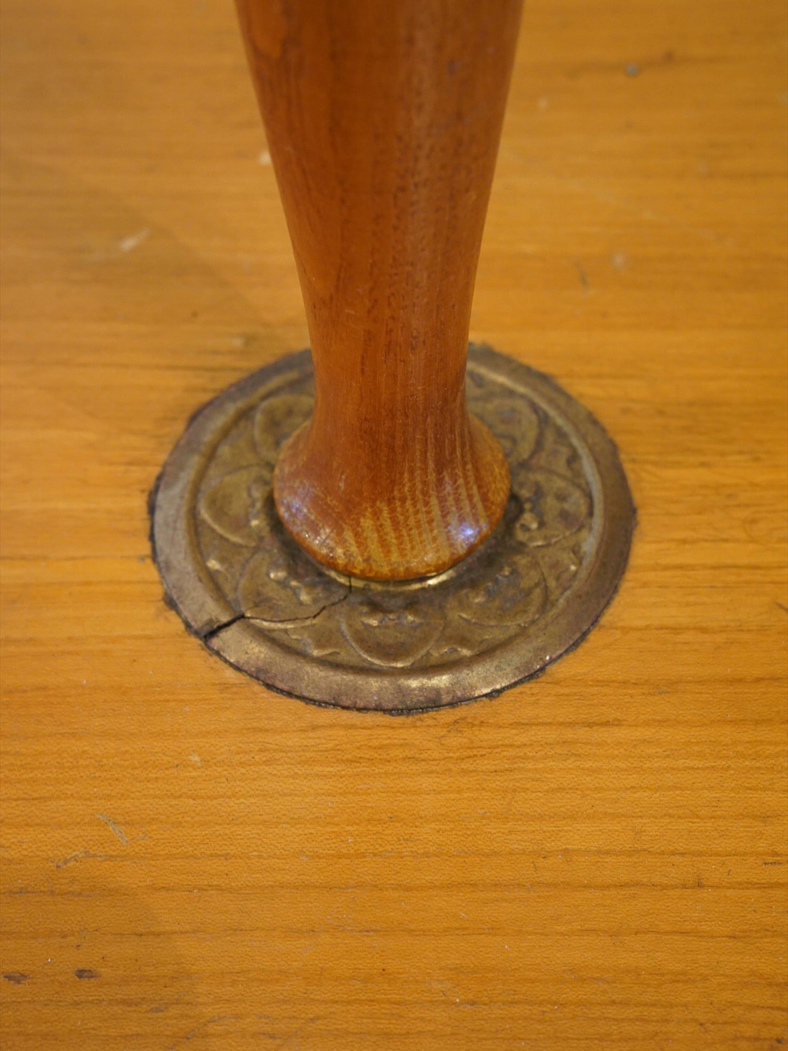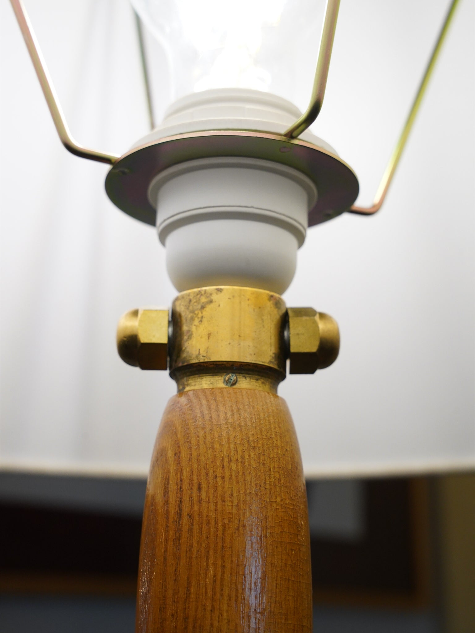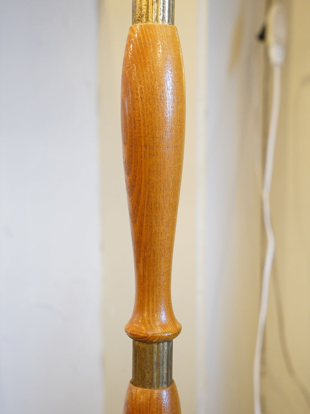 このランプの魅力は、職人の手による滑らかなロクロ細工と、真鍮のアクセントが織りなす絶妙なコントラストにあります。支柱は複数の丸みが作られたボビン形状で、その境界には真鍮製のリングが挟み込まれています。木の温かみと金属のモダンさが調和した、非常に洗練されたデザインです。