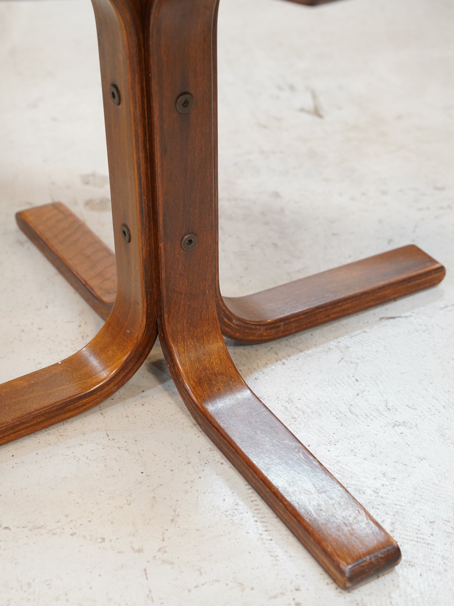 最大の特徴は、一本の支柱から四方へとしなやかに広がる脚部のデザインです。ミッドセンチュリー期に多く見られた構造美を感じさせつつ、木の質感を活かした仕上げにより素朴な温もりも同時に醸し出しています。ハイバック仕様の背もたれは、緩やかなカーブが身体のラインに沿うように設計されており、座った瞬間に包み込まれるような安心感を提供します。