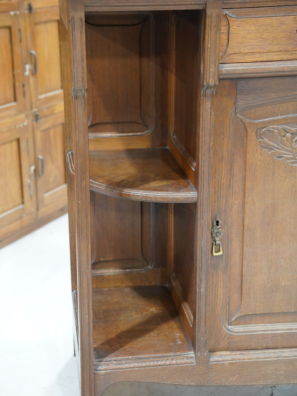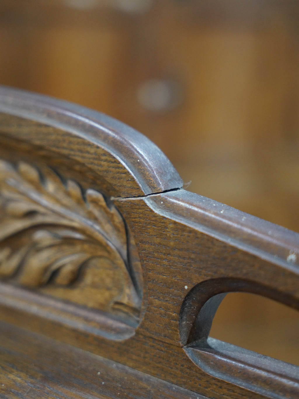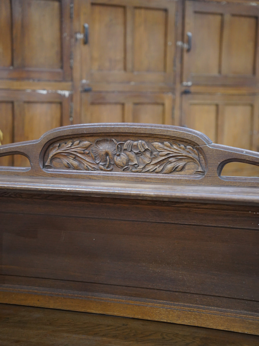 上部の緩やかなカーブを描く装飾には、植物をモチーフにした繊細な手彫りの彫刻が施されており、この家具が作られた当時の職人のこだわりと技術を感じさせます。