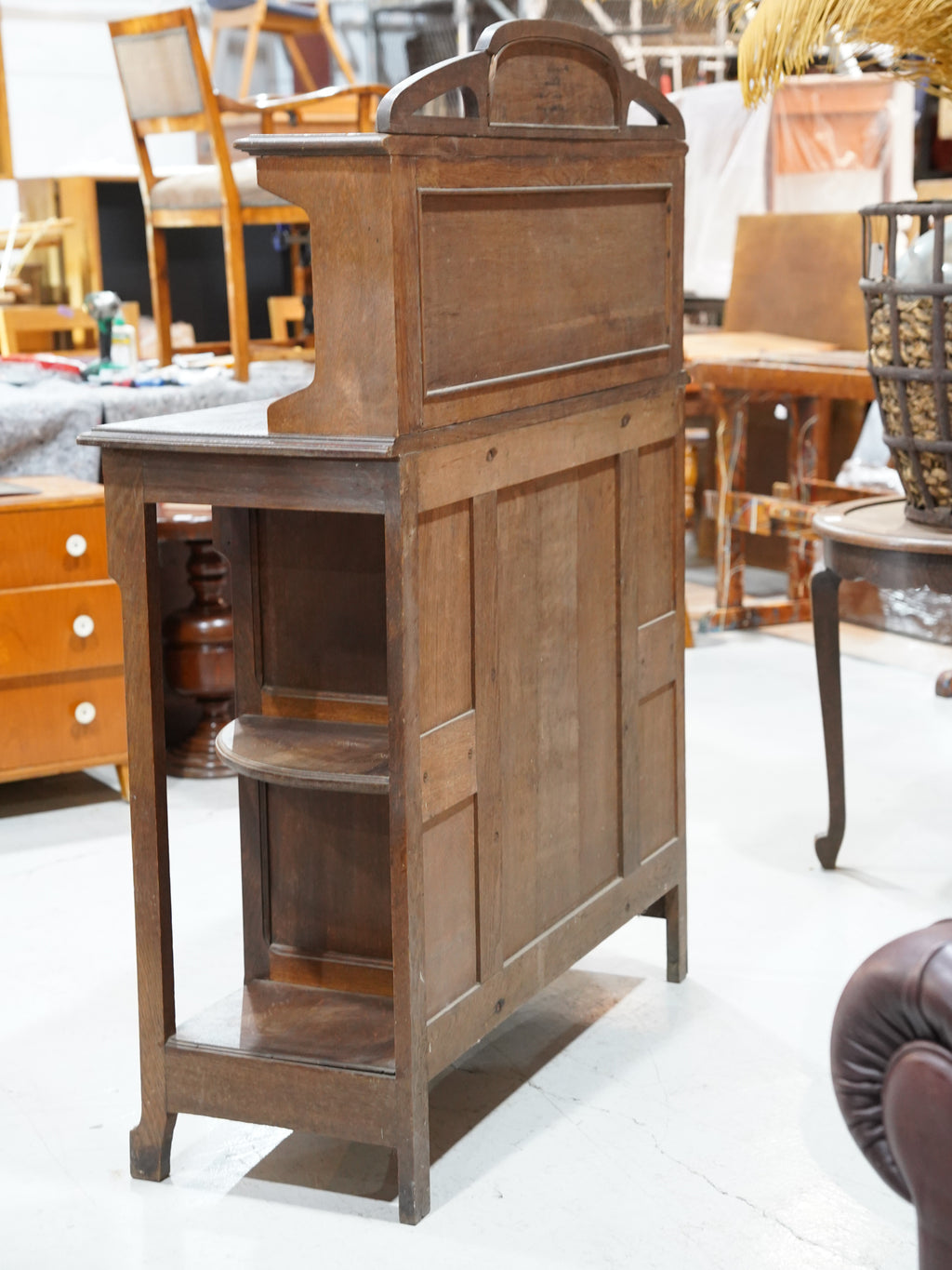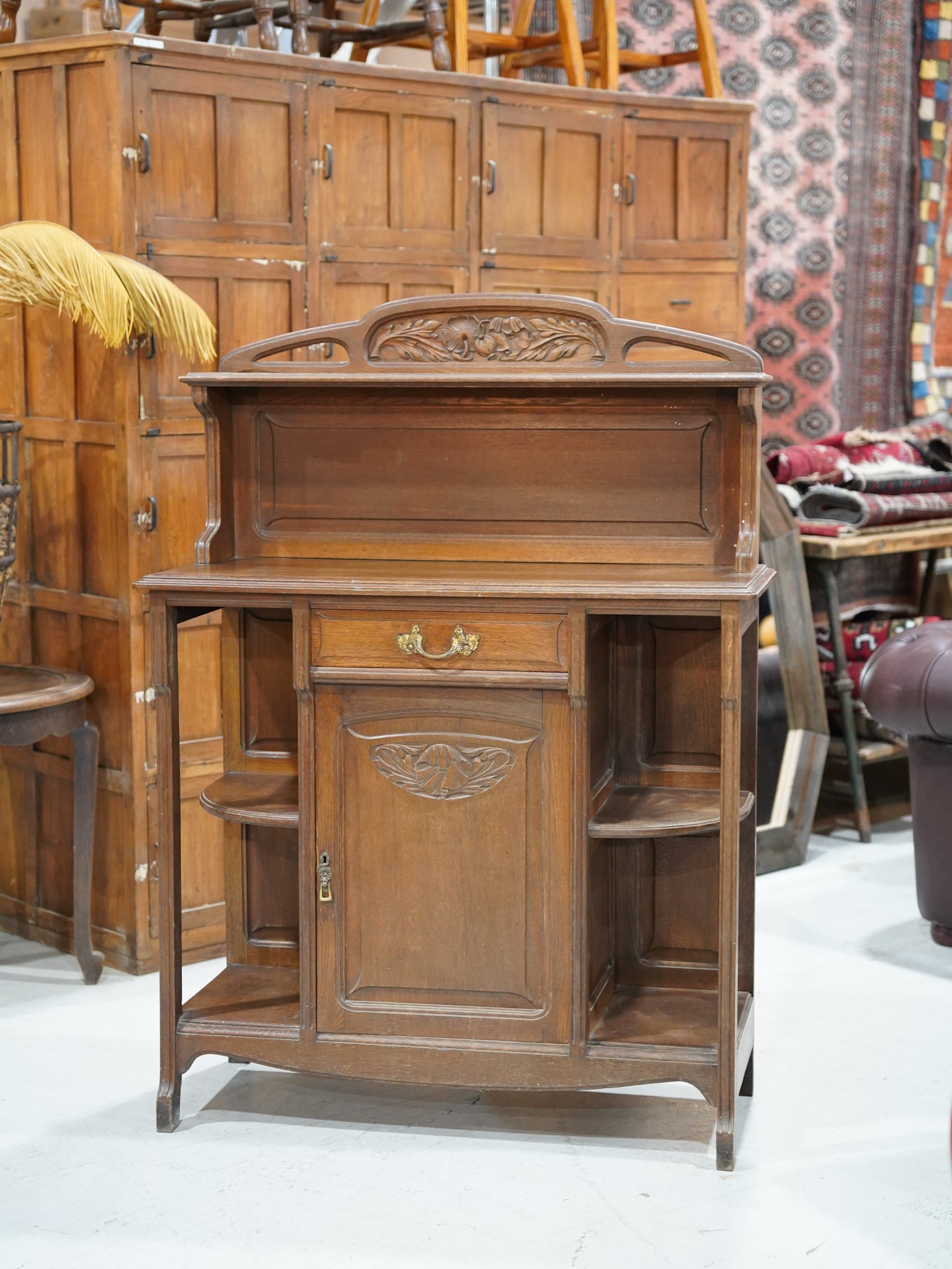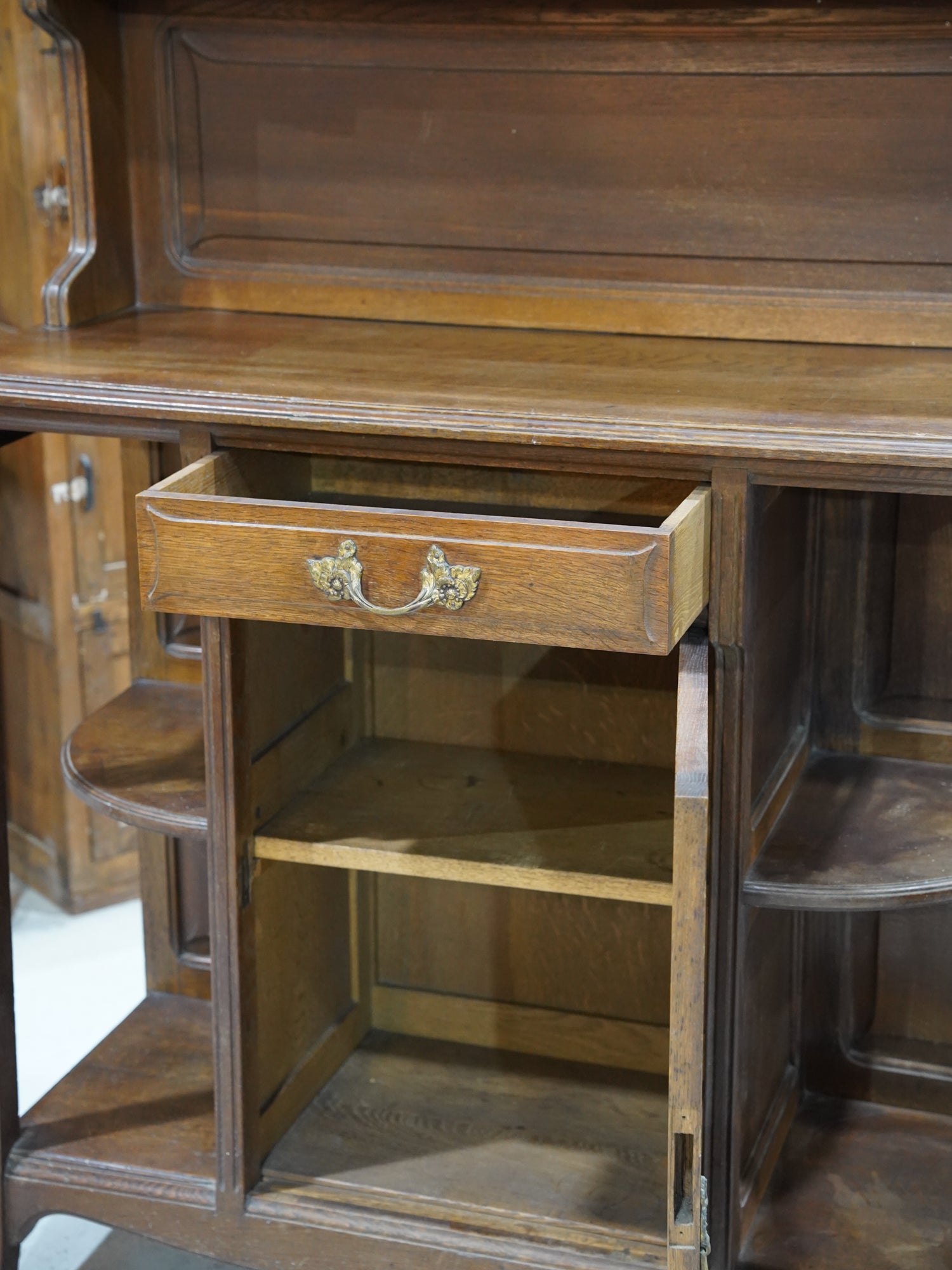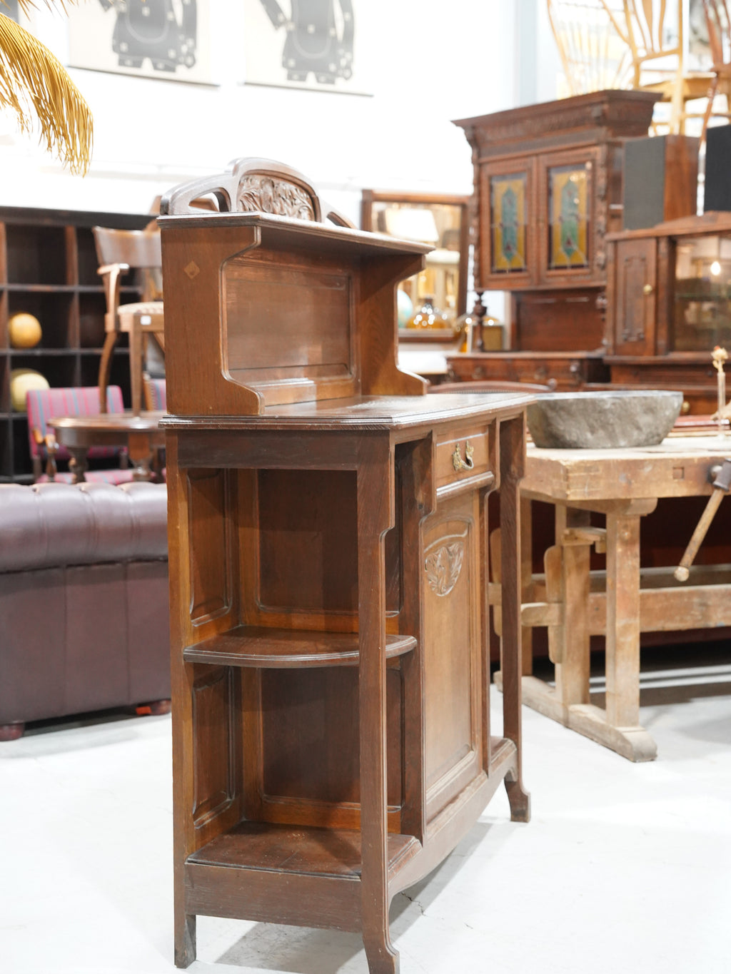 上部の緩やかなカーブを描く装飾には、植物をモチーフにした繊細な手彫りの彫刻が施されており、この家具が作られた当時の職人のこだわりと技術を感じさせます。