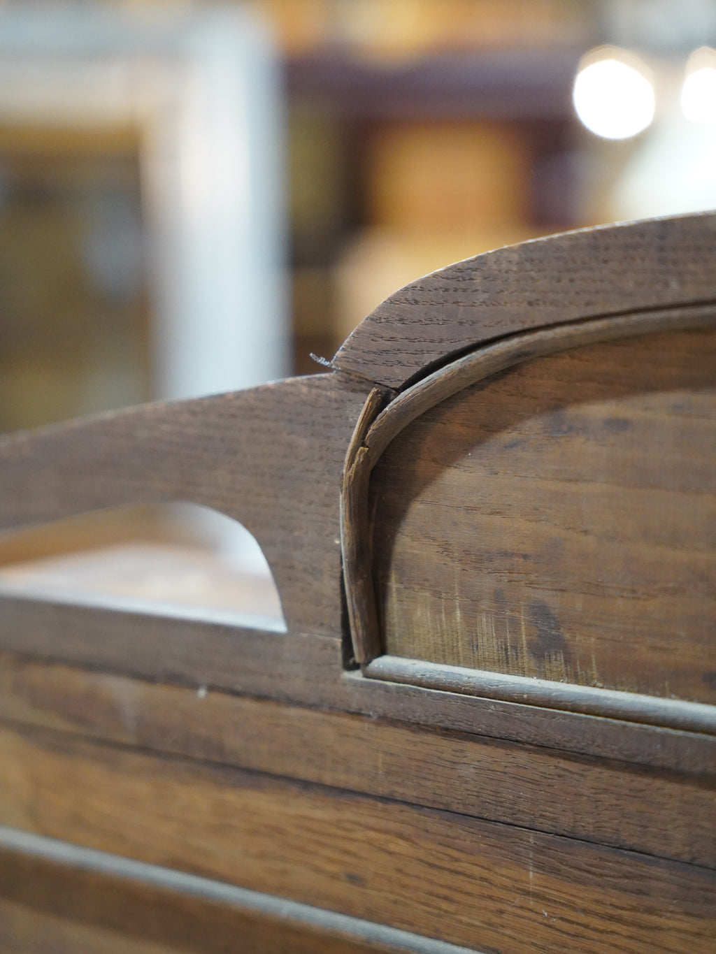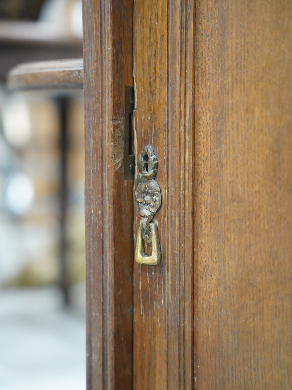扉の鍵穴周りや、引き出しの取っ手には、経年変化によるくすみや傷が、かえってヴィンテージとしての価値を高めています。