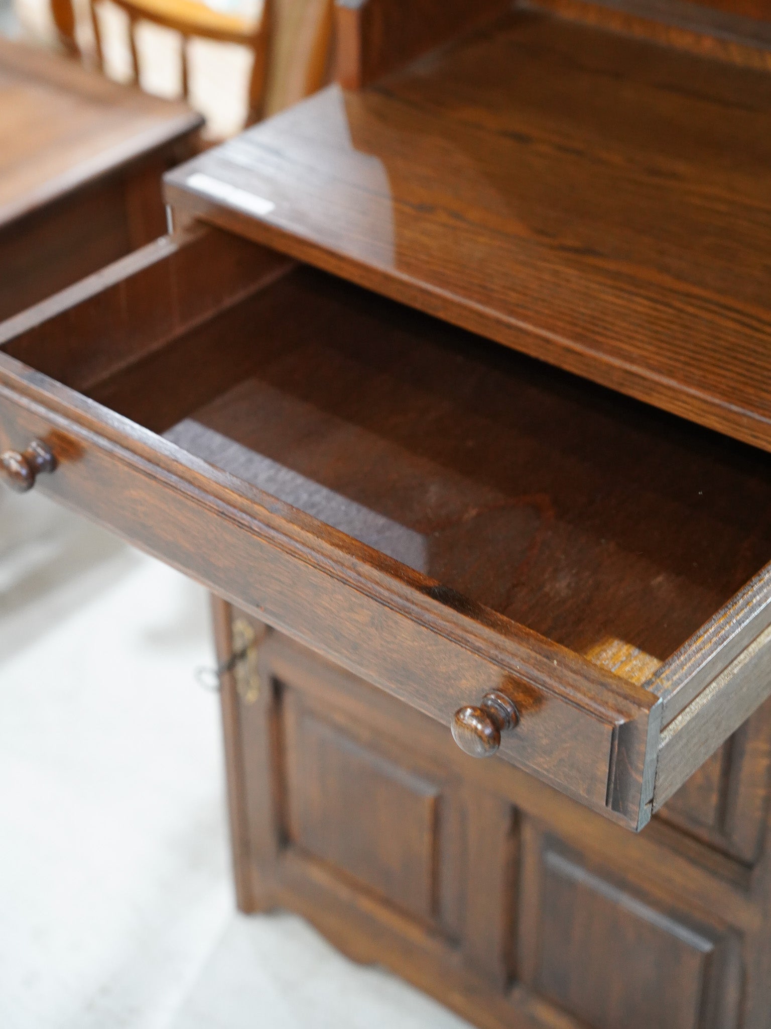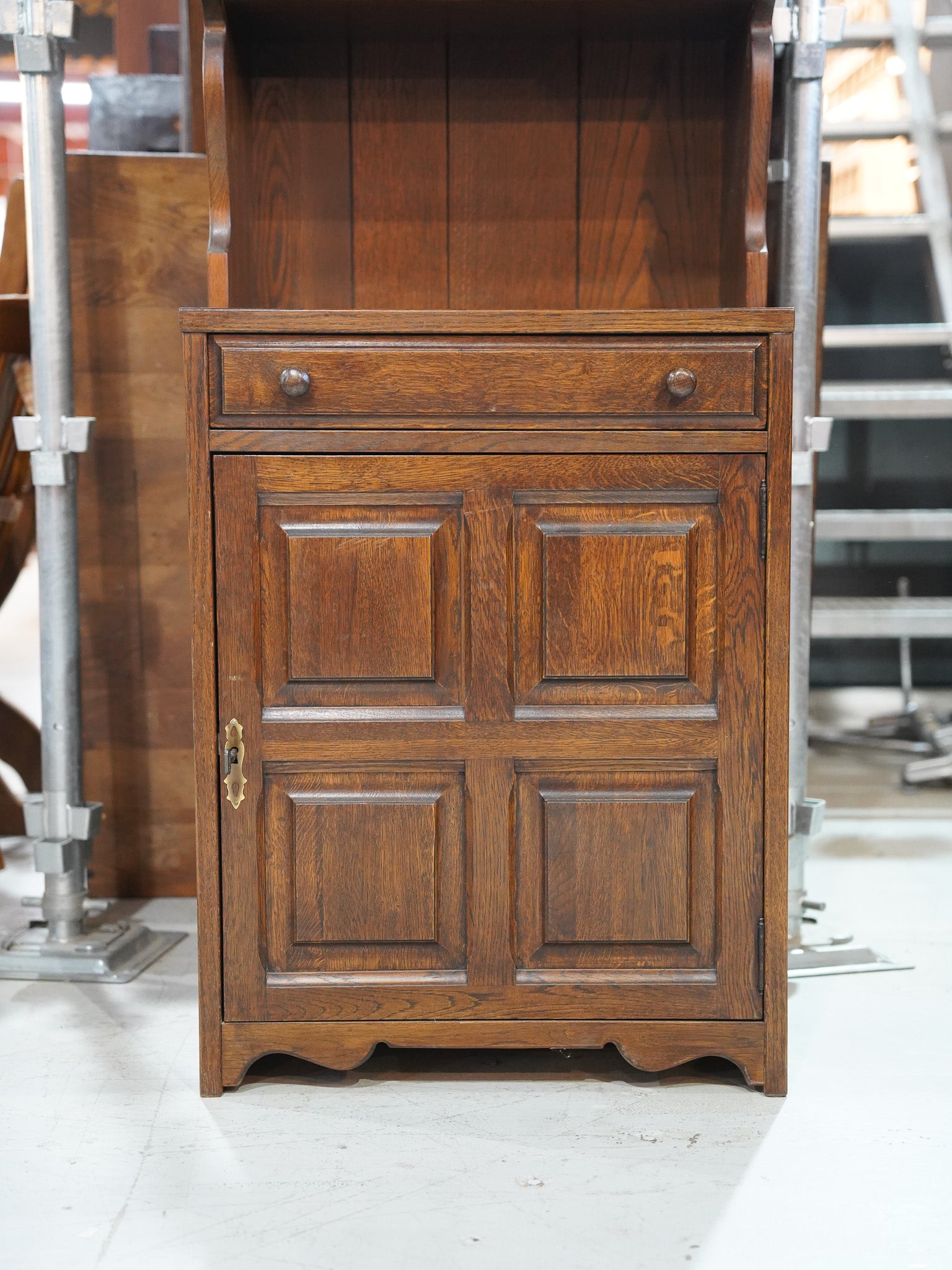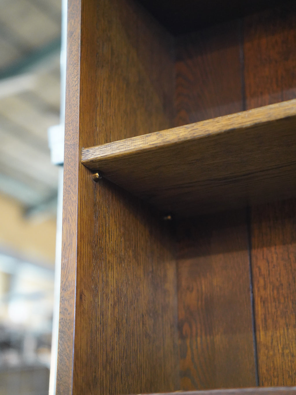 扉内には棚板があり、隠したいものや高さのあるものを収納できる十分なスペースを確保しています。扉の四枚パネルデザインが、クラシックなイギリスの家具らしい重厚感を加えています。