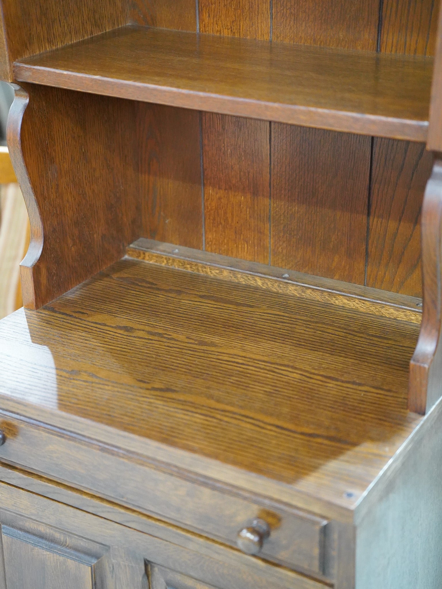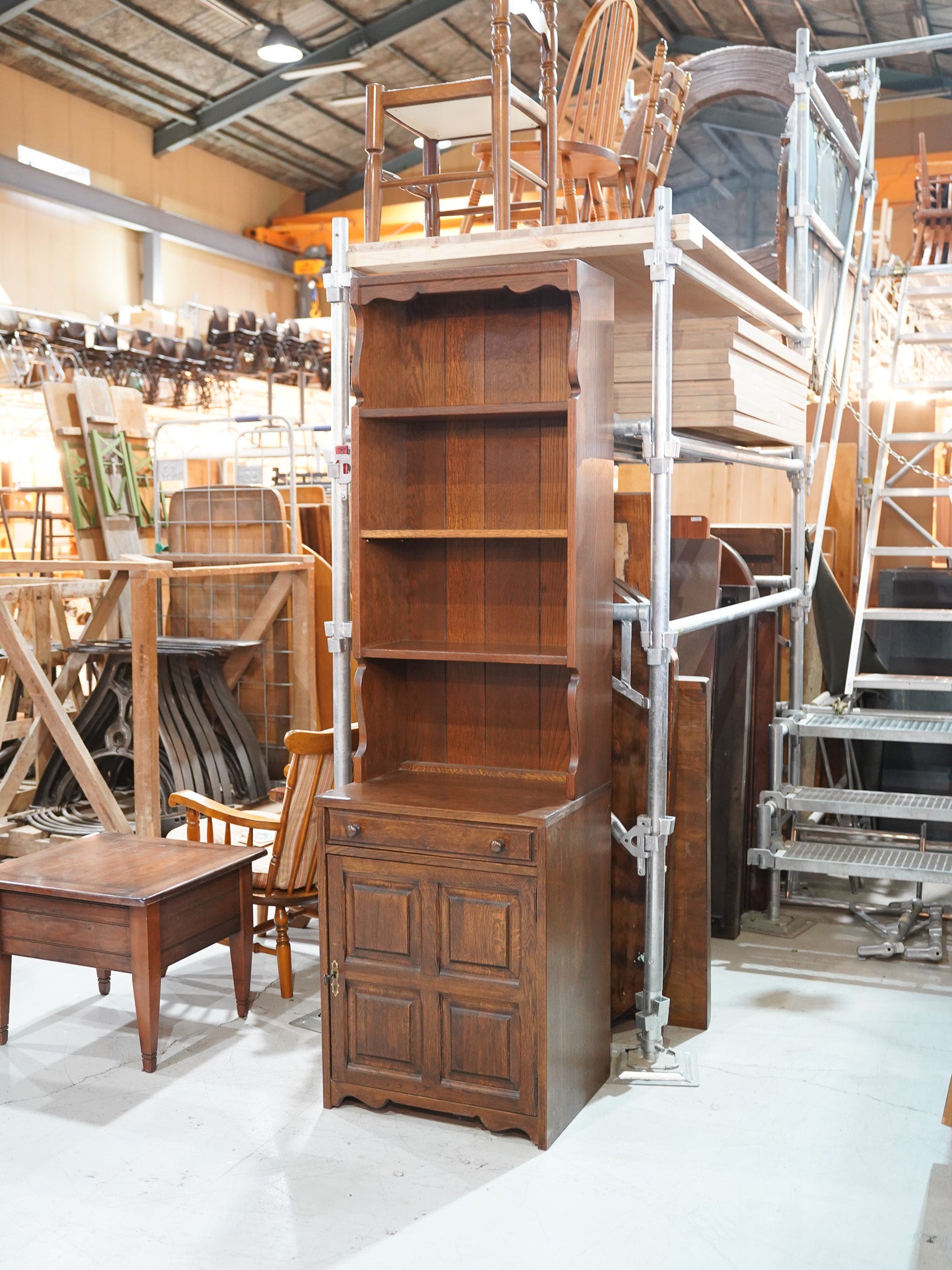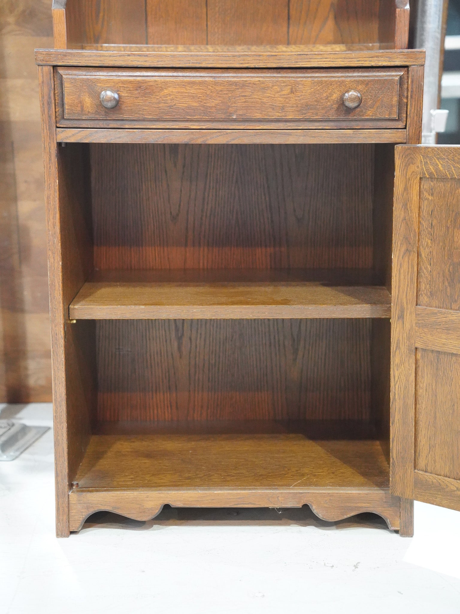 扉内には棚板があり、隠したいものや高さのあるものを収納できる十分なスペースを確保しています。扉の四枚パネルデザインが、クラシックなイギリスの家具らしい重厚感を加えています。