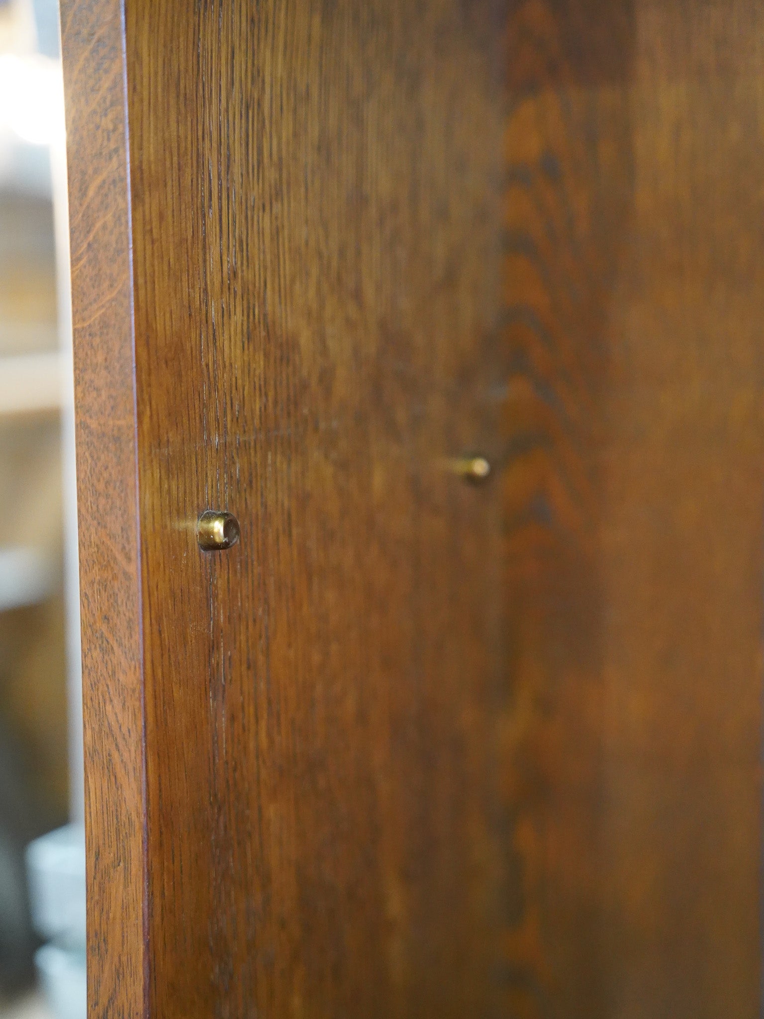 全体に見られる削り出しの装飾や、引き出し・扉の金具が、新品にはない時を超えた味わいとエレガントさを演出しています。