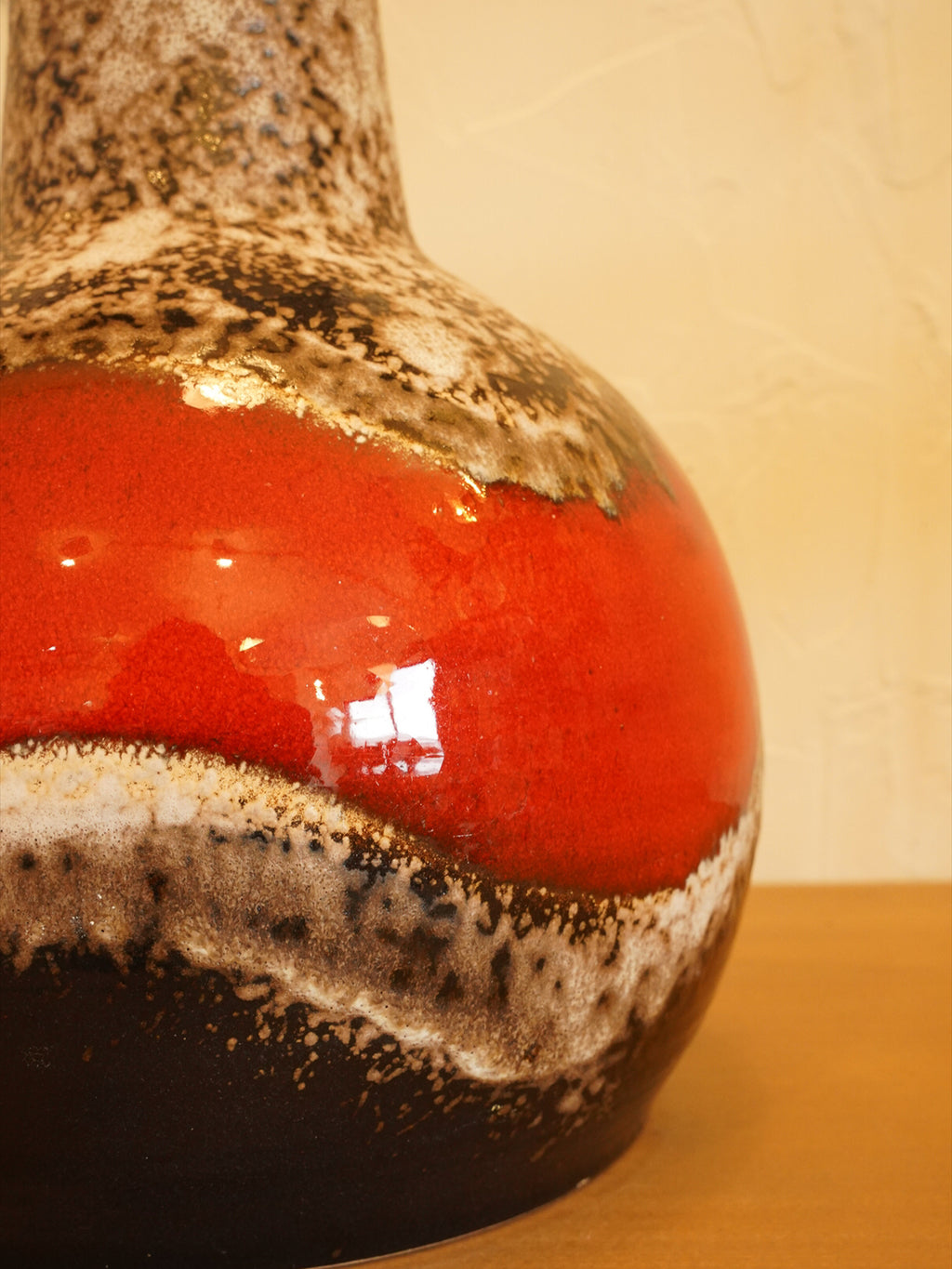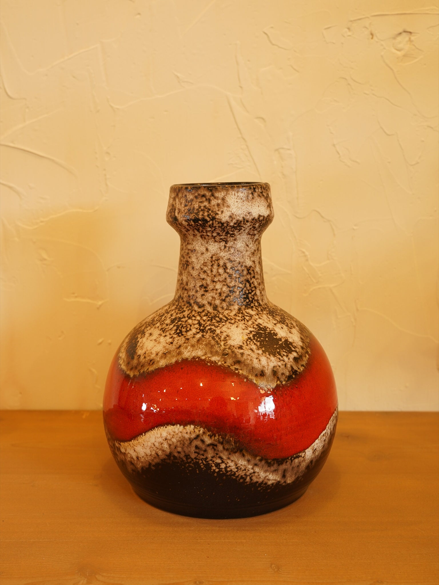 ベースは白や茶、黒の斑点状の溶岩テクスチャで覆われ、その中央を大胆に貫くのは、光沢のある艶やかな赤の帯。この赤と黒の鮮烈な対比と、テクスチャの異なる釉薬の融合が、見る者に強烈な視覚的インパクトを与えます。