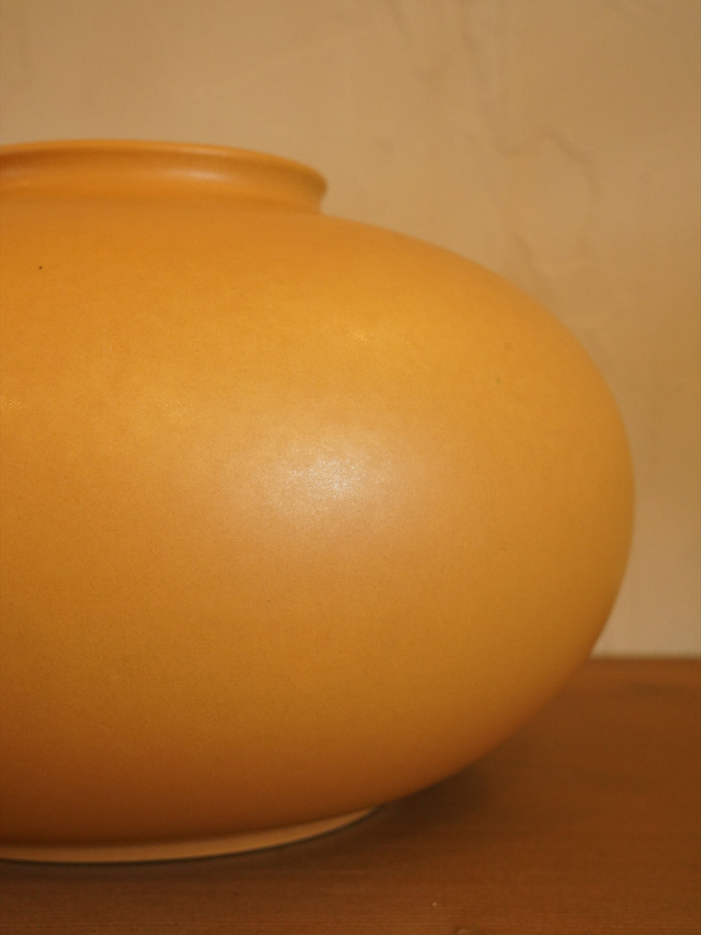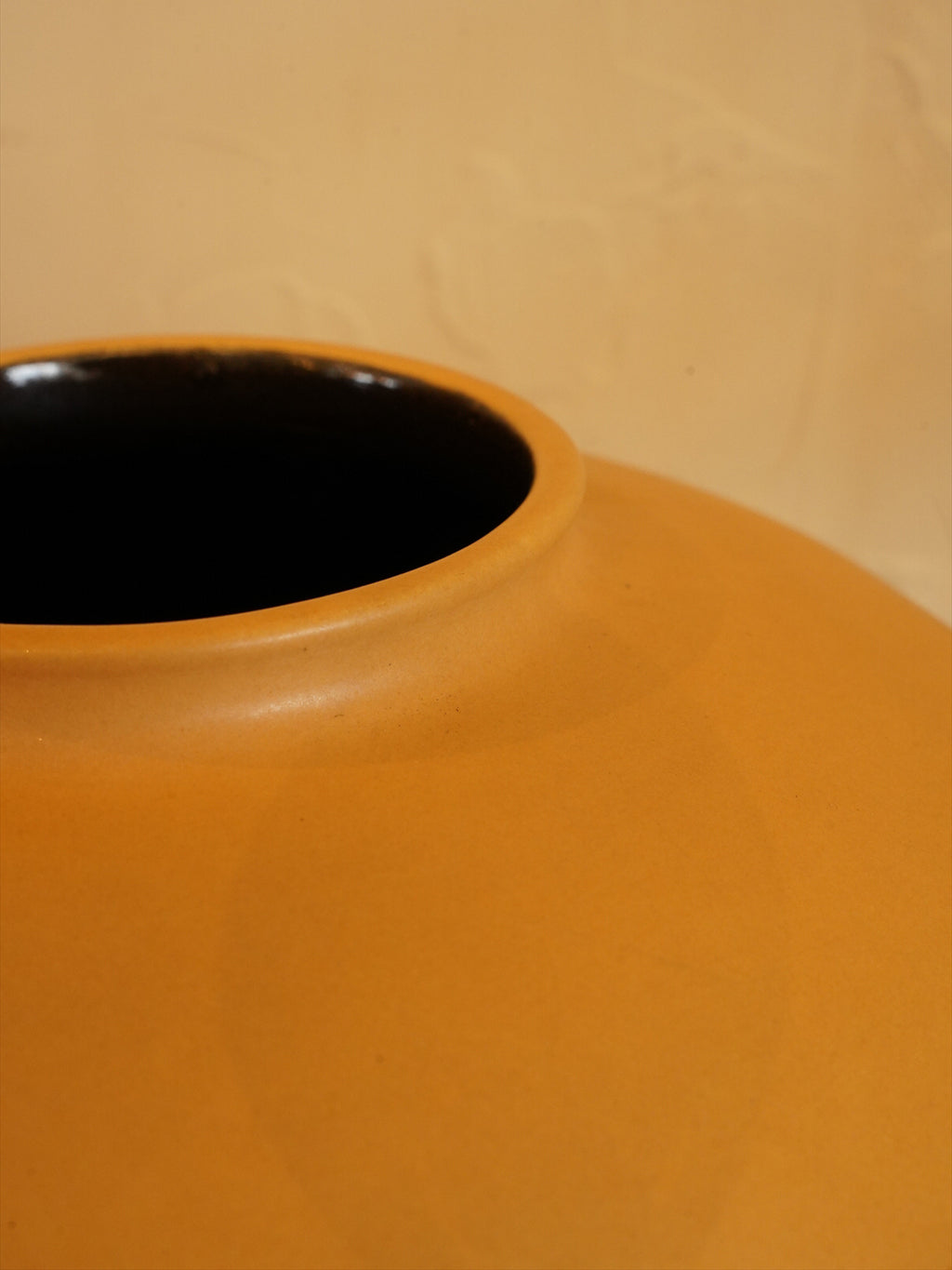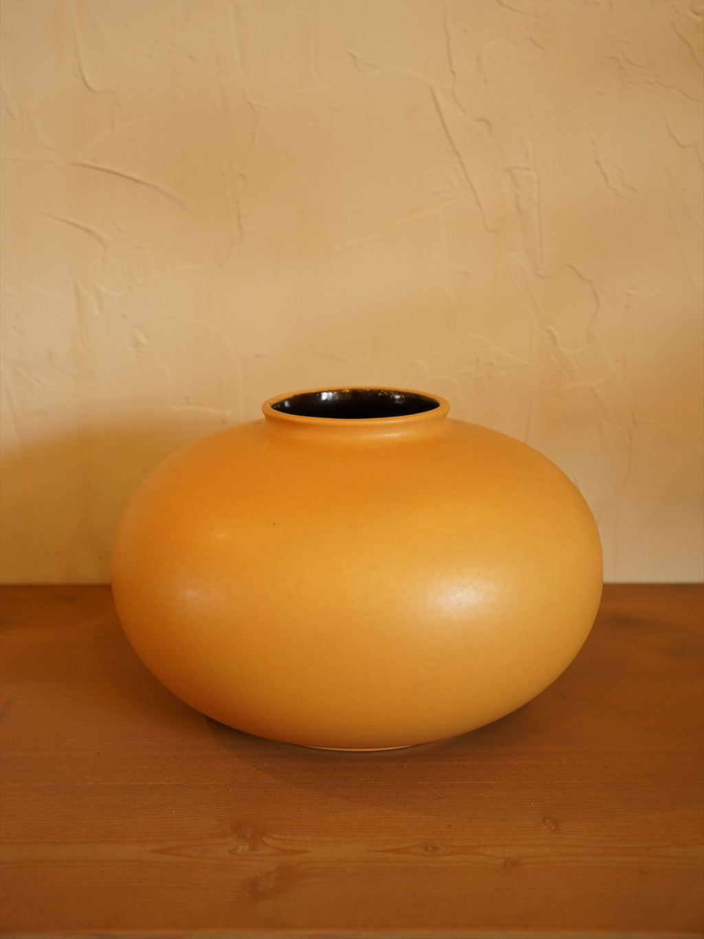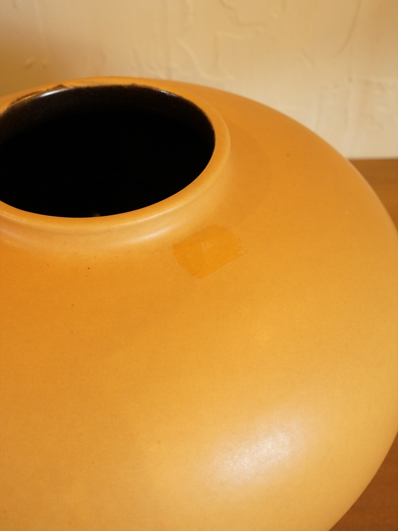 外側は、時代を象徴するような鮮やかでマットなイエローオーカー(黄土色)の単色釉薬で仕上げられており、温かみがありながらも洗練された印象です。一方、内側は光沢のある深みのある黒で、外部との美しいコントラストを生み出しています。