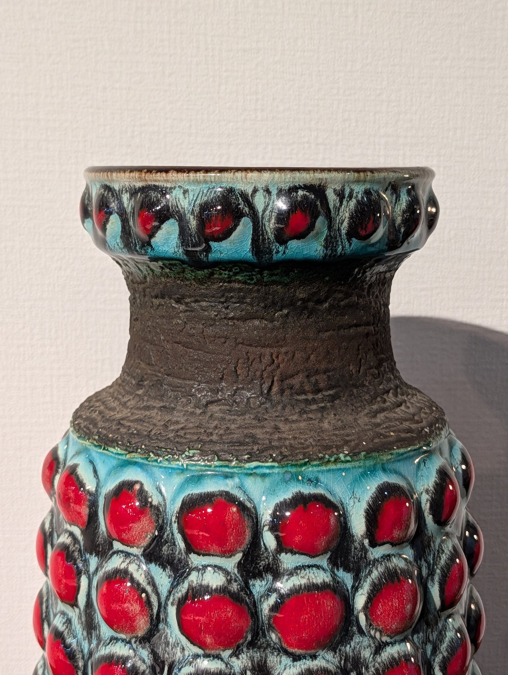 深くざらついた茶色の素地の上に、鮮烈なルビーレッドのバブル(泡)状の突起が規則的に浮き出し、その境界をターコイズブルーとブラックの釉薬が覆う、まるで燃え盛る火山のようなテクスチャは圧巻です。